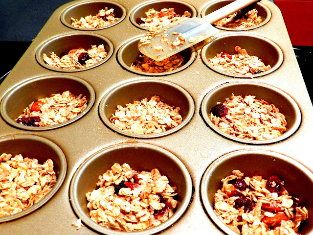 After the ingredients are thoroughly mixed, spoon the mixture into a greased cupcake pan like so. I used a pam to grease the pan and a spatula to really pat them down.